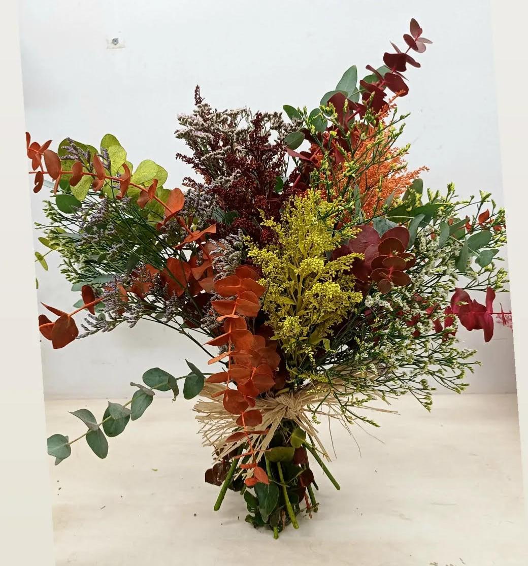 Ram d'eucalipto amb tons de tardor i flor menuda. Es pot tenir fresc amb aigua o deixar-lo directament sense aigua i aguanta molt temps sec.