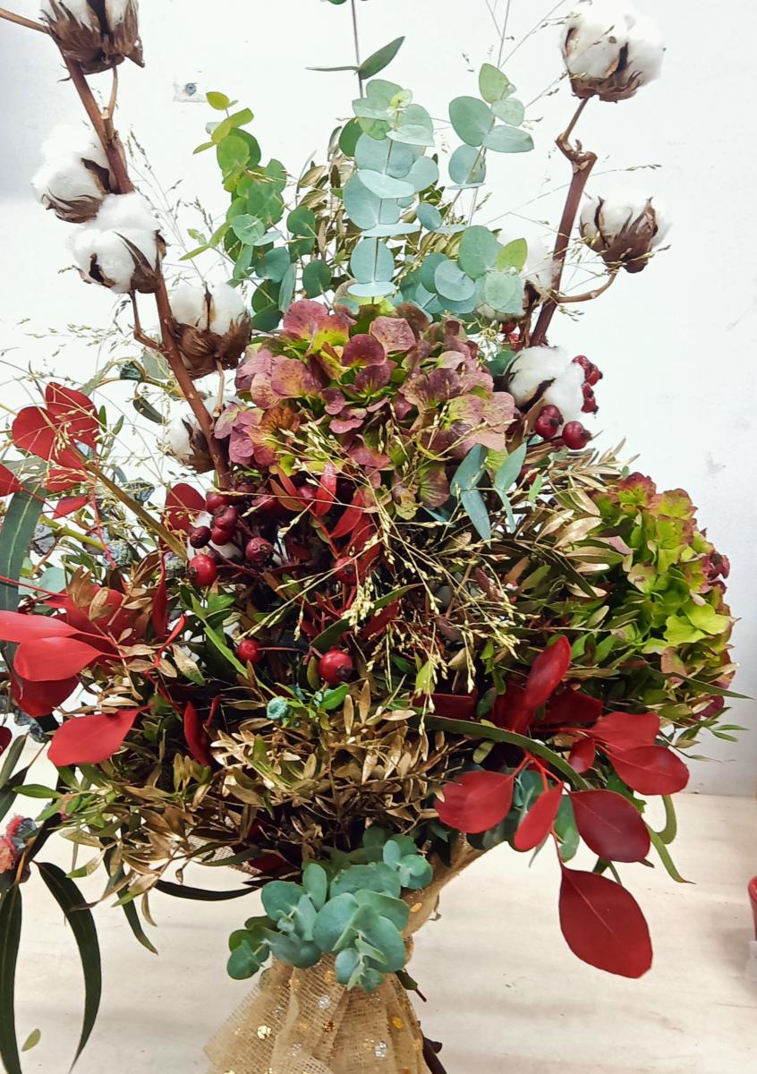 Ram amb diferntes classes d'eucaliptus i verds tenyits. Es un ram que es pot guardar sense aigua i si es vol sec per tot l'any.